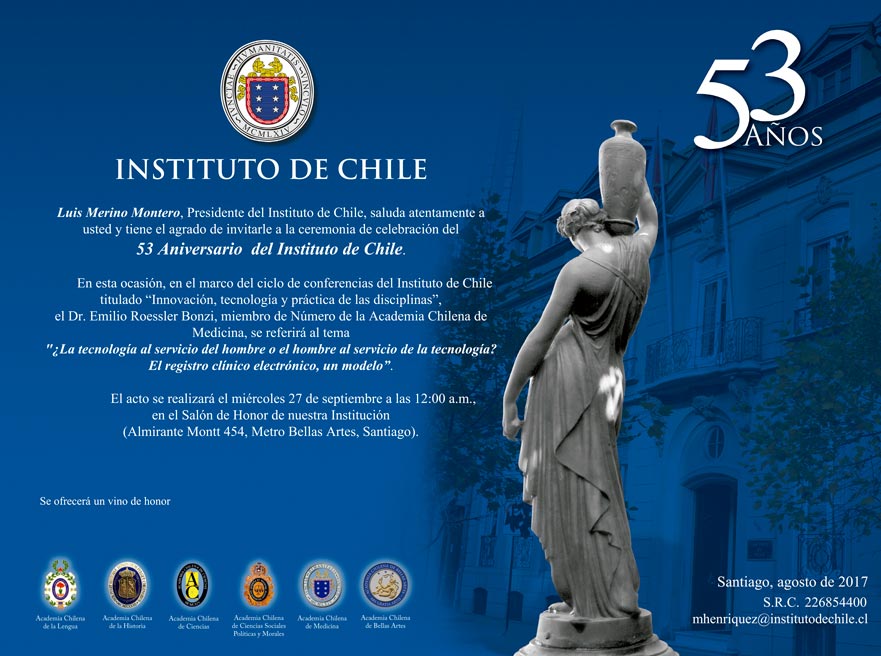 El Instituto de Chile, fundado en 1964, celebró sus 53 años este pasado miércoles 27 de septiembre, en el Salón de Honor de su Institución. En este contexto, ha sido invitado como autoridad el Presidente de la Asociación de Sociedades Científicas-Médicas de Chile, para participar de unas palabras del Dr. Luis Merino Montero – Presidente del Instituto de Chile, de la conferencia del Dr. Emilio Roessler sobre el tema “¿La tecnología al servicio del hombre o el hombre al servicio de la tecnología?; el registro clínico electrónico, un modelo” y un Vino de Honor. La presente invitación ha sido un gran honor y un privilegio para nuestra institución, por la instancia de poder compartir con las autoridades de la Academia Chilena de la Lengua, Academia Chilena de la Historia, Academia Chilena de Ciencias, Academia Chilena de Ciencias Sociales, Políticas y Morales, Academia Chilena de Medicina, Academia Chilena de Bellas Artes.